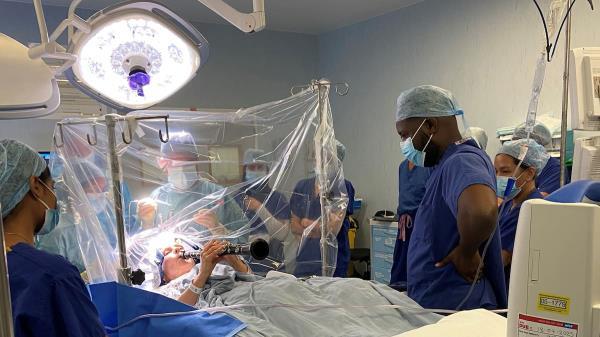 医生们准备进行脑部手术,医疗工具整齐排列。
