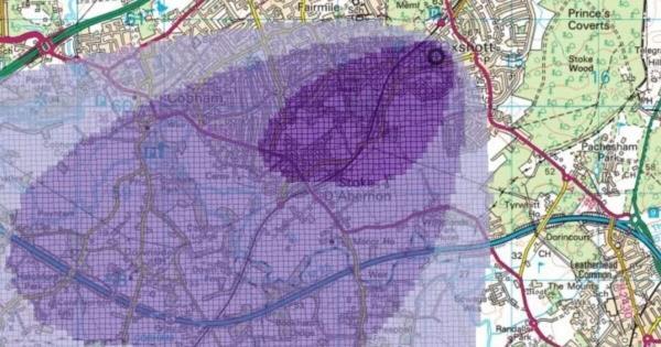 萨里消防局发布的影响地图触目惊心——以奥克肖特为中心的大片区域已被化学事故染红。